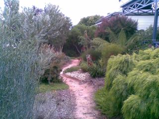 I had the pleasure of working on a wonderful example of interplanting edibles with non edibles on this largely native garden. It reminded me that veggie gardens don’t have to stand alone – but can enhance the trees / shrubs already in place. I think this is the feel that the Spiral Bed really needs. The pathway in the front native garden demonstrates how you can make the most out of the space you have. By dividing it in two by a narrow path you can walk within the garden and appreciate from within – rather than simply looking from a frontal perspective. The compost bins are also a feature which I would like to replicate with a huge pile wood down the side that needs a use. This property which was once a Dairy is an absolute pocket of country living in Melbourne. Again it reminds me that you don’t need the hobby farm – just start now where ever you are!!