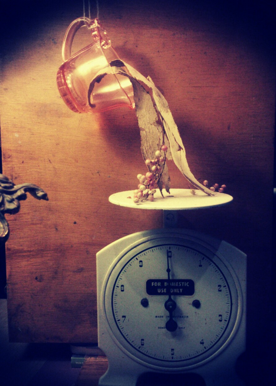 Had a lovely lazy Sunday down at the local bowls club followed by some still life set up time – working with the themes of object, weight and the experience of time and memory. Why do some objects gather soo much value while others we are happy to leave by the side? These kitchen scales were used by my sister, cousin and myself to bake scones at Nana’s. I often see similar sets of scales in op shops – and somehow think – although identical – they’re not the same as mine!